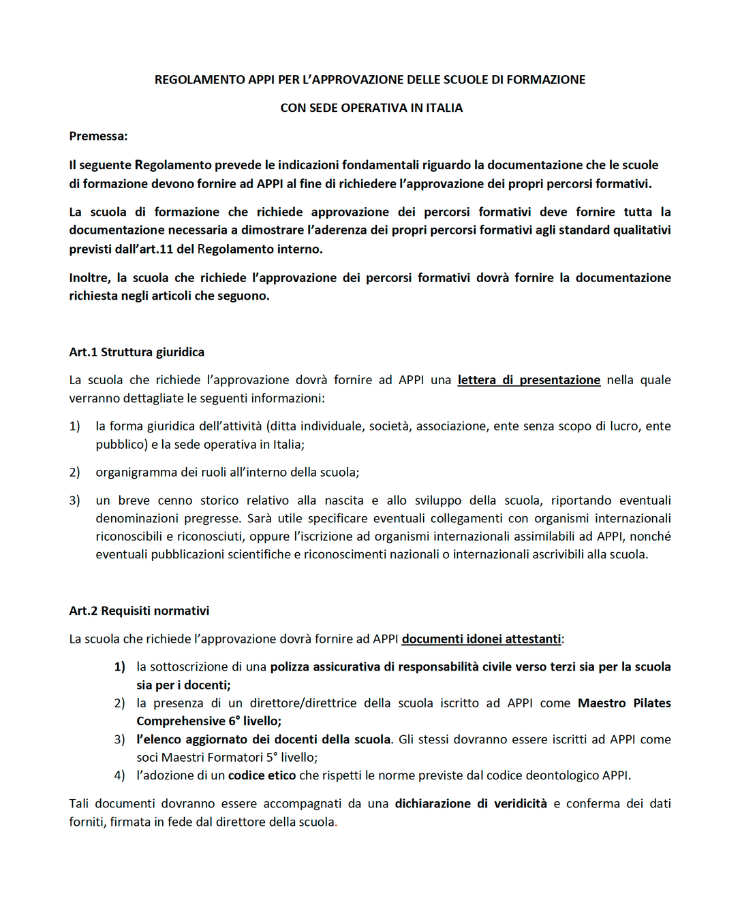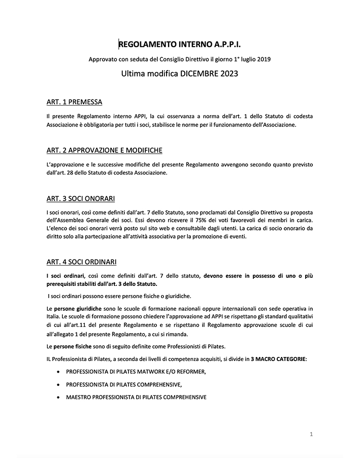 APPI (Associazione Professionisti Pilates in Italia) è un’Associazione iscritta nel Registro del Ministero dello Sviluppo Economico. Ai sensi della legge 4/2013. Senza scopo di lucro che nasce dalla volontà dell’attuale Presidente Lucia Nocerino. Dopo un lavoro di analisi ricerca e valutazione. Riunire tutti i professionisti che da più di venti anni operano nel settore Pilates in Italia.